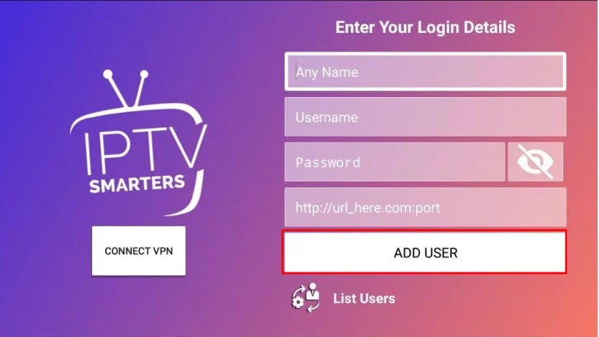 4. Type the IPTV credentials given by your IPTV Provider and click the Add User button.