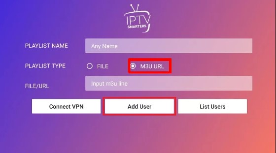 9. If you choose the option Load Your Playlist or File/URL, enter the Playlist NameTypeM3U URL link, and click Add User.