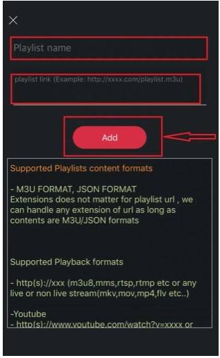 6. Enter the Playlist name and M3U URL link given by your IPTV Provider on the box and select the Add button.